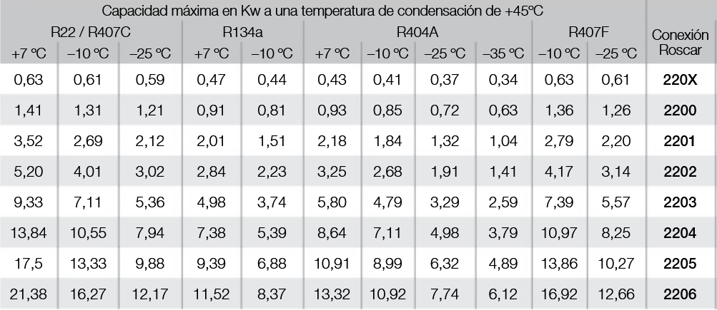 Maximum capacity in Kw at a condensation temperature of + 45ºC