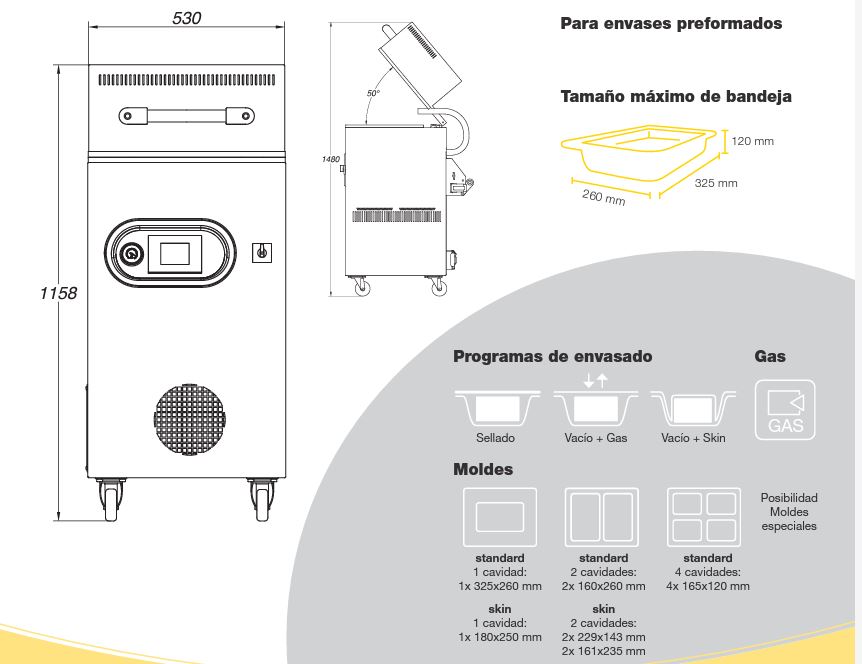 Es la única máquina que permite el envasado con “skin”, “skin+gas”, vacío y en atmósfera modificada o simplemente sellado.